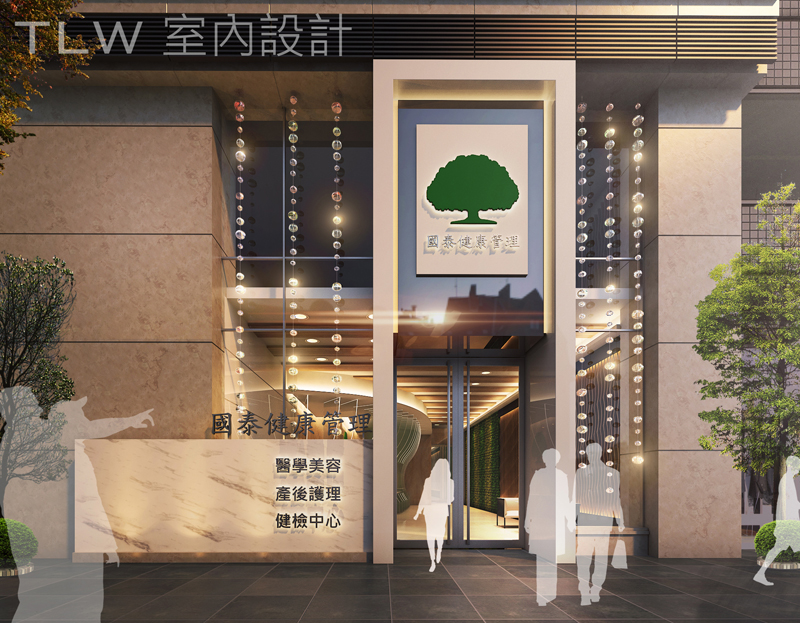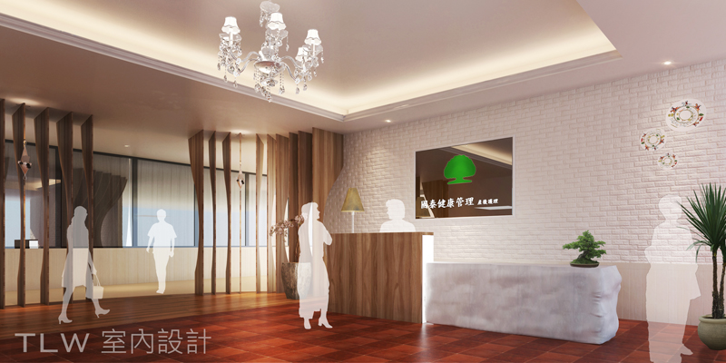 在入口意像部分,我們希望能突顯健康管理會館的視覺焦點,所以在入口左側設置了大型招牌當作入口指引.另外配合水晶琉璃吊飾以期引人目光.