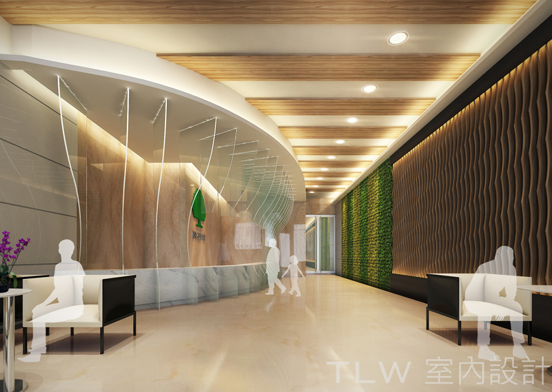 一樓大廳則是以"地"為概念,強調安定自然的力量,並以玻璃立體造型作為國泰榕樹意象的延伸,另外在大廳中加入植生牆作為自然的元素.